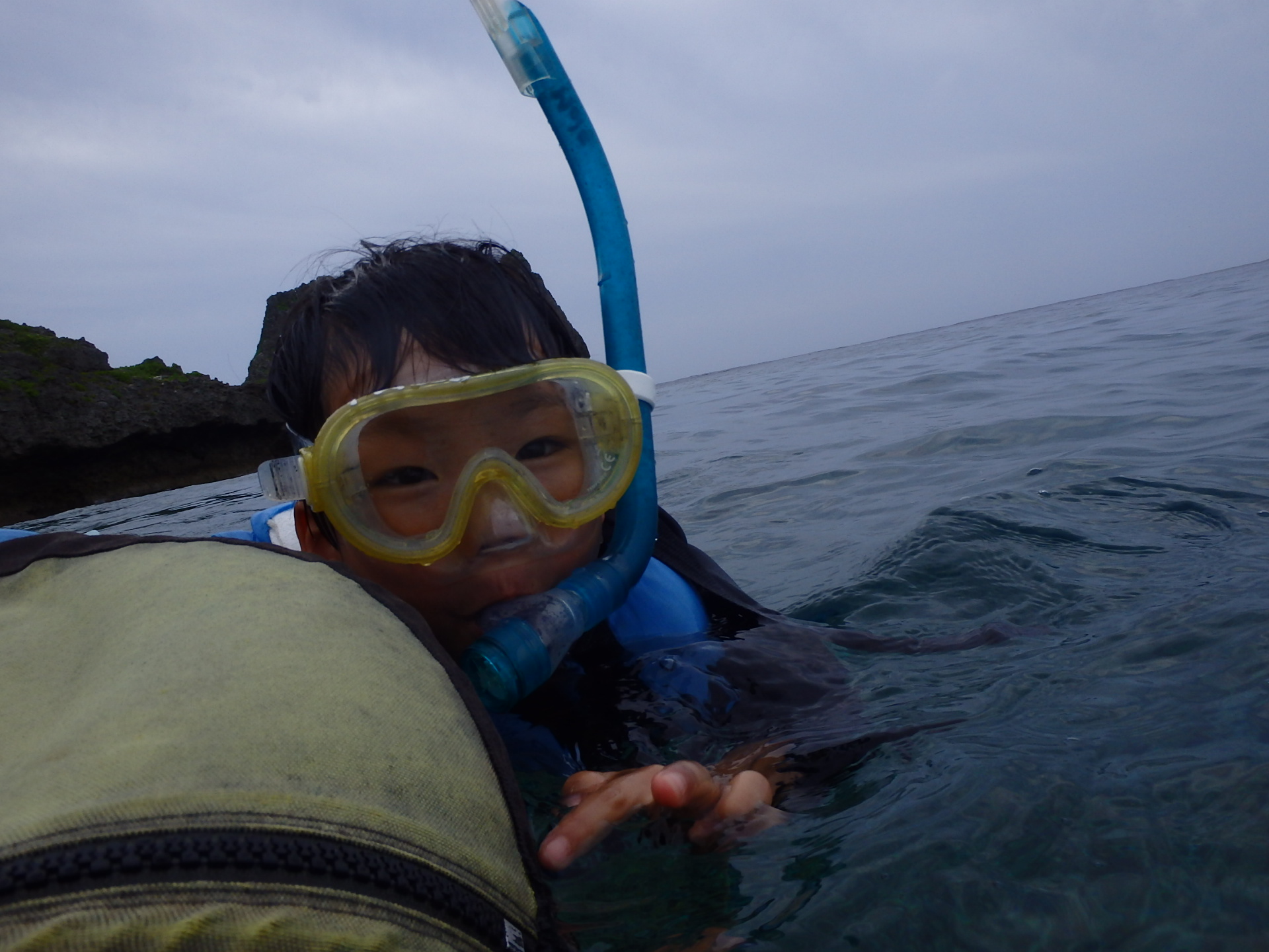 昨年は、シーカヤックとセットの業者さんでしたので、店舗のあるところで、マリブビーチからの出発でしたが、今年はシュノーケリングONLYということで、真栄田岬集合。なんと、ここの業者さん達って、店舗ないんですね。みなさんワゴン車にウェットスーツぶら下げて案内していらっしゃいます。これで安いのか~と納得。でも、水中での体験時間70分程度と、運動不足の体にはかなり堪えるハードメニューでした。6歳なりたての年長さんでも休憩なしのフル遊泳でしたので、弱音は吐けませんが・・・・。