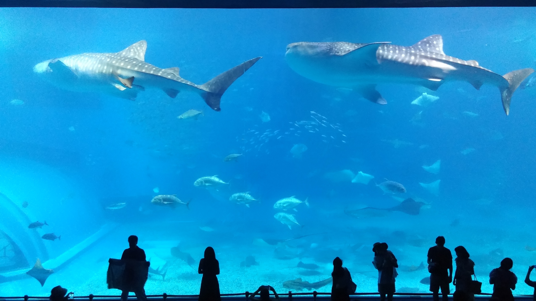 色んな所で見る、大水槽の写真ですが、比較的簡単に素人でもこんな写真が撮れます。これはスマホで撮ったものです。うまく2尾のジンベイザメが枠に収まりました。